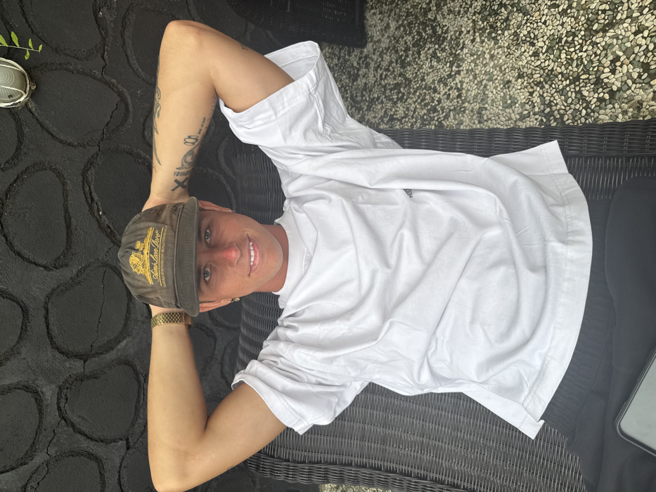 A male subject, appearing to be in their 20s or 30s with a light complexion and short dark hair, is depicted reclining on a dark woven rattan chair. He is smiling faintly, looking directly at the camera. He wears a white short-sleeved t-shirt, black trousers or shorts, and a dark green baseball cap with a light-colored "Aimé Leon Dore" logo on the front. A gold-colored wristwatch is on his left wrist, and a small hoop earring is in his left ear. Multiple tattoos are visible on both arms, including abstract designs on the left and text/symbols on the right. His nose and cheeks show some redness, possibly from sun exposure. A dark-colored smartphone is partially visible on the lower left, resting on his lap or the chair. The background features a dark, textured wall composed of large, rounded, raised elements, likely stone or concrete. In the upper right background, a white light fixture and some green foliage are visible. The flooring in the lower right consists of a light-colored pebble-dash or aggregate surface. The scene is located in Uluwatu, Indonesia.