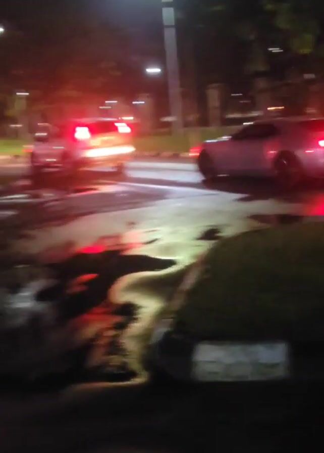 The video, shot at night, depicts a street scene with two cars visible: one silver and one white. Both cars have their rear lights illuminated. The silver car appears to be accelerating away from the viewer. The road is wet, with puddles reflecting the car lights. A raised curb, painted white and black, separates the road from a patch of grass. In the background, several streetlights illuminate the scene, casting light through the trees. Additionally, several people are discernible in the background. The video is somewhat shaky, indicating it might have been recorded handheld.