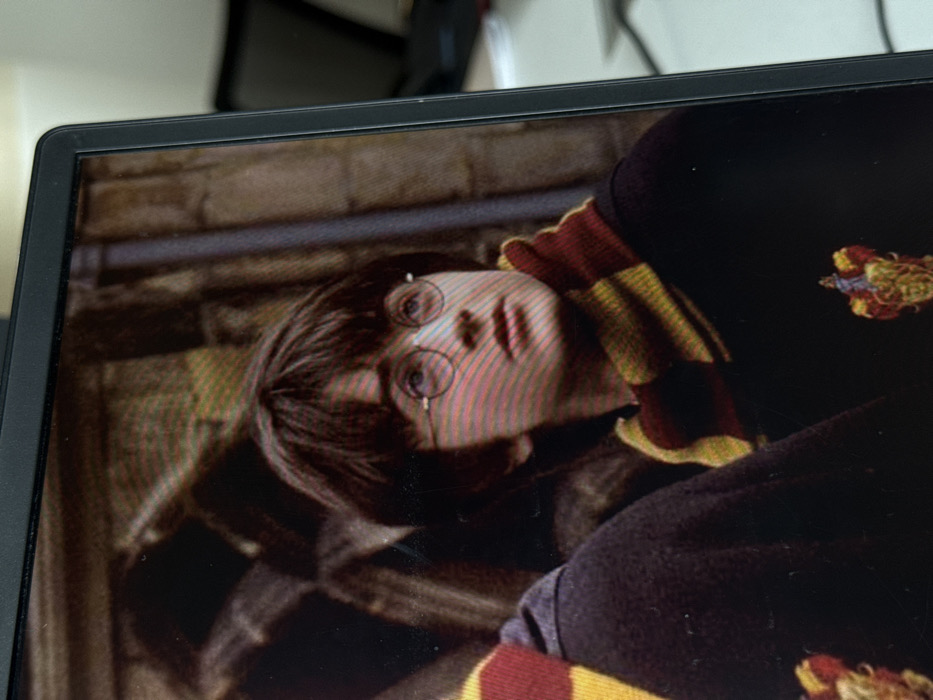 A photograph captures a computer monitor displaying a still image from a film. The central subject is a young male with short, dark hair and round glasses. He is wearing a dark robe, and a red and gold horizontally striped scarf is draped around his neck. A shield-shaped crest, featuring a lion rampant, is visible on the left chest area of his robe. His gaze is directed upwards and slightly to the right. To his immediate left, the back of another individual, similarly clad in a dark robe and a red and gold striped scarf, is partially visible. The background within the displayed image consists of intricate, textured stone architecture, including archways and blockwork, suggesting a castle-like environment. The monitor itself features a black bezel and displays a moiré pattern across the image. The immediate environment surrounding the monitor is out of focus, showing indistinct light-colored surfaces and dark objects consistent with an indoor workspace, located in Unknown, Unknown.