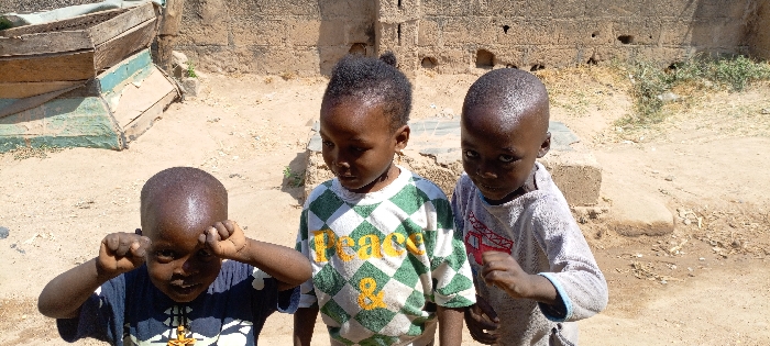 Three young children are depicted outdoors in Ungwan Liman, Nigeria, positioned from left to right against a sandy ground and a light brown adobe wall