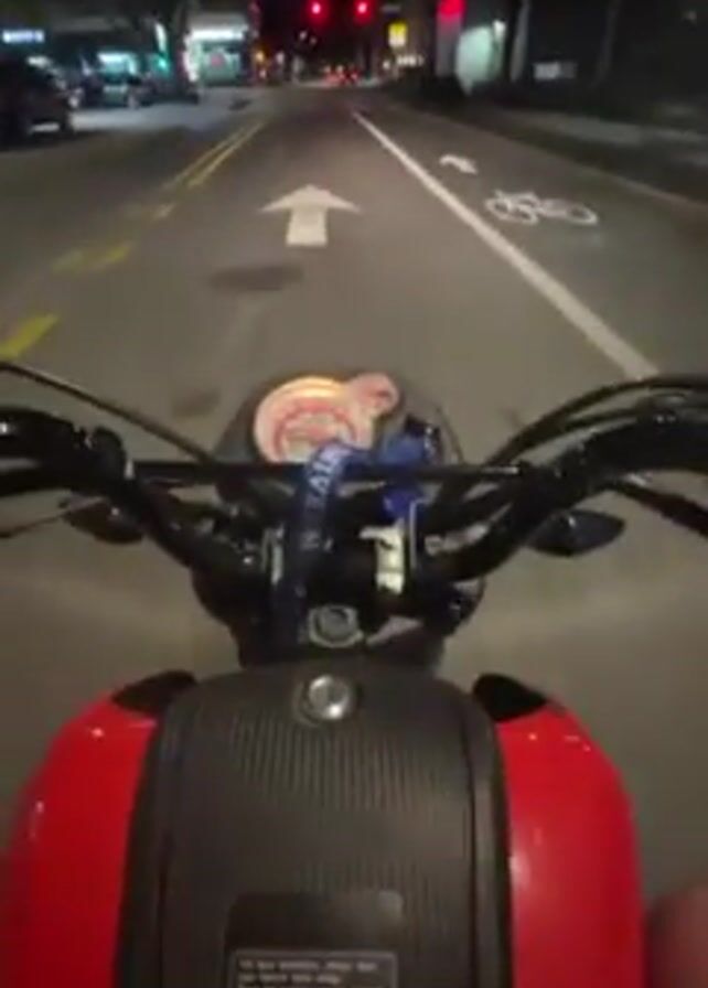 - "first-person view from a red and black moped or small motorcycle stopped at a red light on a city street at night" by FM-jMI1y2, licensed under CC BY 4.0