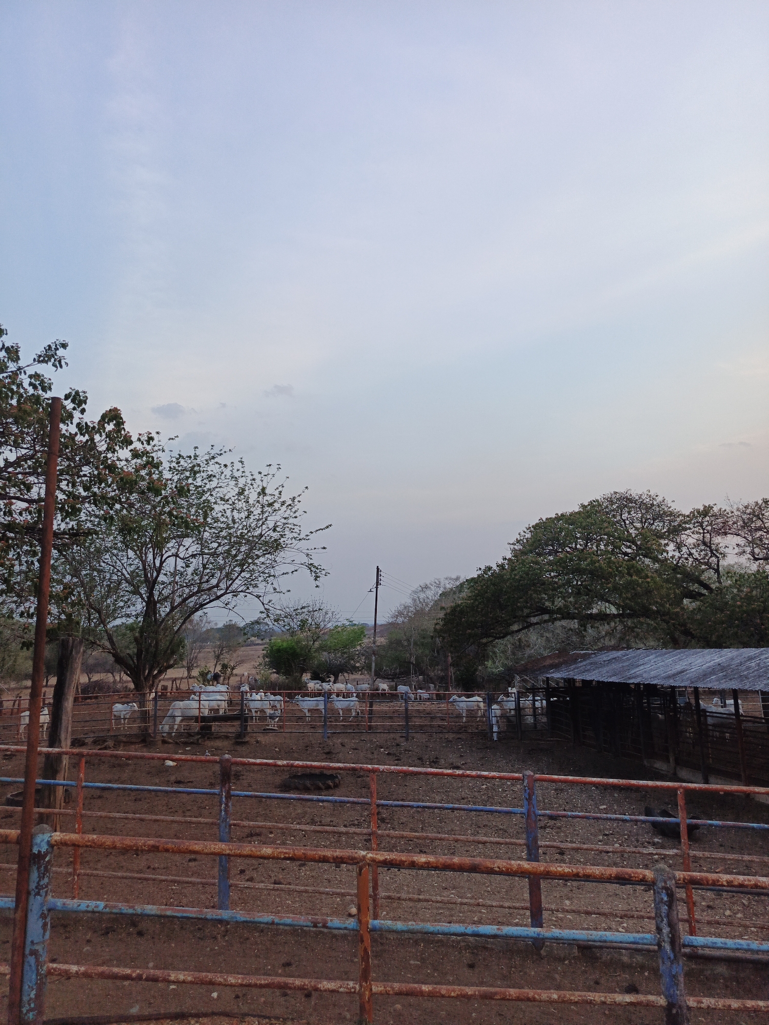 livestock pen in Las Tejas, Venezuela. Several white cattle are enclosed within the pen, which is constructed with weathered, rusted metal fencing in hues of red and blue. Trees are visible behind the enclosure, and a small, covered structure stands to the right of the frame. The sky is pale, suggesting early morning or late evening light. The ground is barren and earthy, showing the effects of heavy use. No people are visible in the image.
