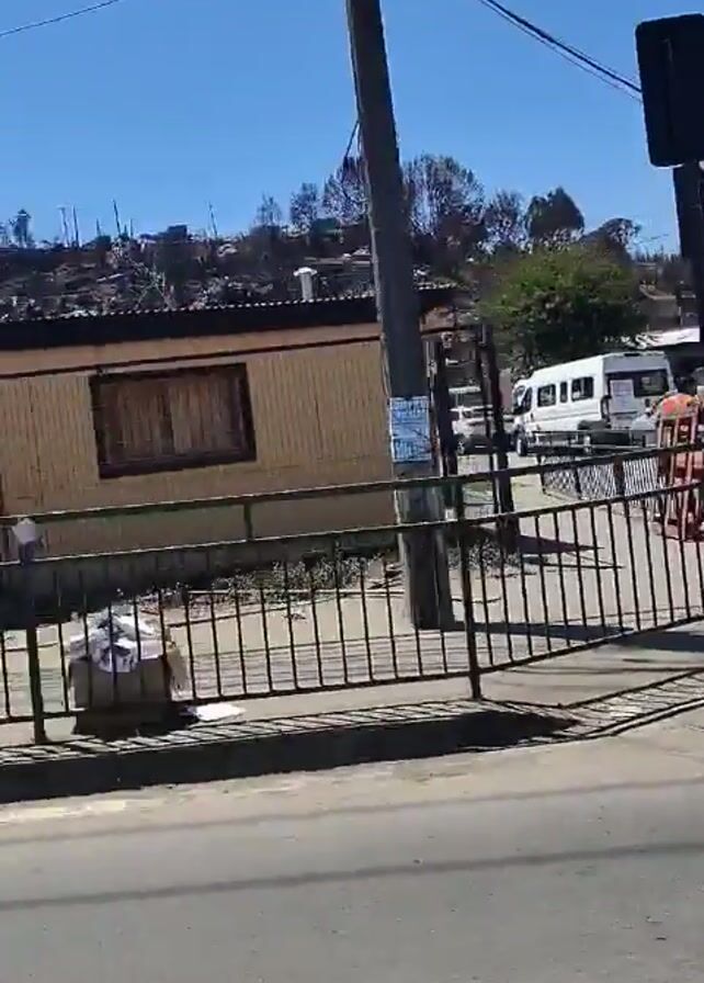 two men in orange vests and dark pants walking in front of parked vehicles in what appears to be a crosswalk. The area seems to be a town, with buildings on either side of the road. The camera then pans to the right, showing several workers in hard hats and uniforms carrying equipment, including what looks like a roll of wires. The workers are walking along a sidewalk next to a fence. In the background, the hillside shows evidence of damage, possibly from a fire. A Chilean flag is visible on the hill. A silver pickup truck is parked near the fence, and there is laundry hanging on the fence. The sky is clear and blue.
