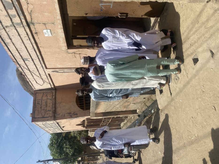 Seven adult males, dressed in traditional Nigerian attire including robes and caps, are gathered on a dirt street at 586 Chiramma street in Chiranchi, Nigeria, under a clear blue sky