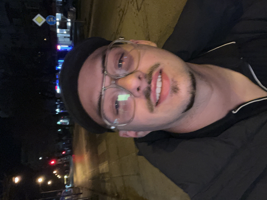 The image displays a nighttime street scene in Varna, Bulgaria. The central subject is a male individual, presenting in a close-up, selfie-style orientation. He possesses fair skin, a mustache, and a goatee, and exhibits a mild smile with visible teeth. He wears large, clear-framed glasses featuring a double bridge, which reflect ambient light sources. A black flat cap or beret covers his head. His attire consists of a black padded jacket, beneath which a dark shirt with a white-lined collar or zipper is visible. The background reveals an urban street environment under artificial illumination. To the left, a pedestrian crosswalk is marked on the asphalt, with a red traffic light visible further down the thoroughfare. Multiple streetlights emit an orange glow. To the right, a yellow diamond-shaped "priority road" traffic sign is affixed to a pole, accompanied by a smaller, circular blue traffic sign. Buildings line the street, some featuring illuminated windows and prominent blue and red neon lights. A dark-colored vehicle is partially discernible parked on the far right side of the street. Trees are silhouetted against the dark night sky along the streetscape. No other individuals are visible in the scene.