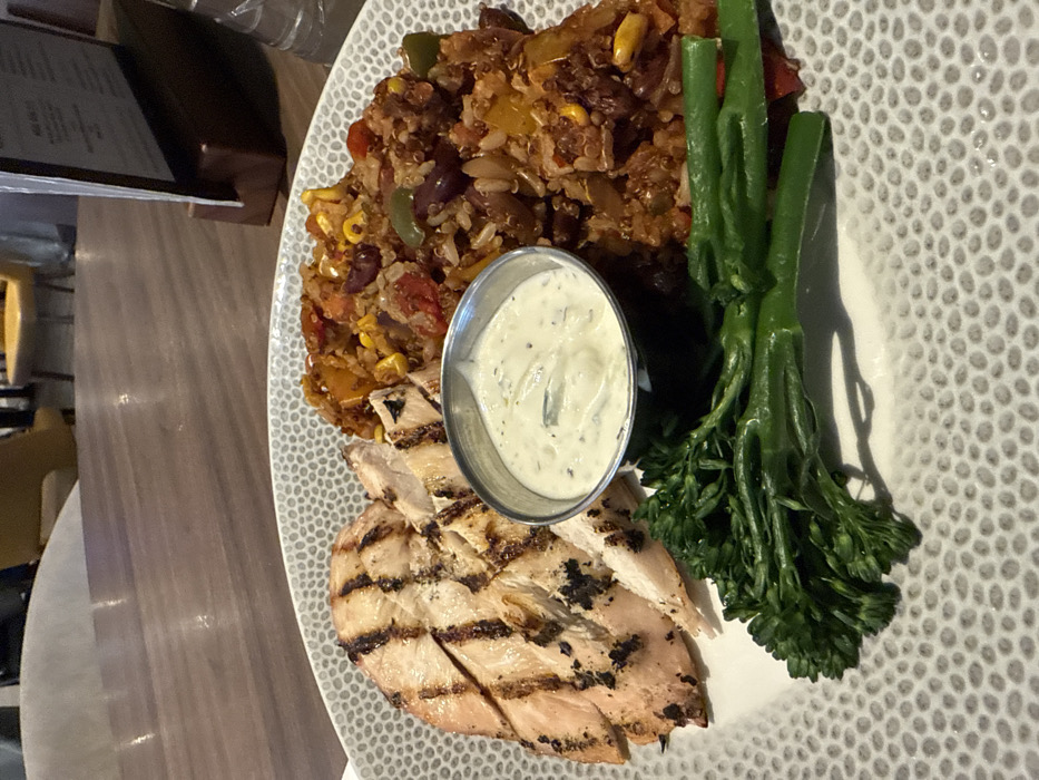 The image displays a prepared meal on a textured white and grey plate, positioned on a dark wooden table within a dining establishment in West Suffolk, United Kingdom. The plate contains a grilled chicken breast, partially pre-sliced, exhibiting distinct char marks. Adjacent to the chicken is a portion of mixed grain salad, visibly composed of quinoa or rice, corn kernels, kidney beans, and diced bell peppers (red, green, and orange/yellow). A small metal ramekin, holding a creamy white sauce with visible green herb fragments, is placed between the chicken and the salad. Below these components are several stalks of green vegetables, identifiable as either tenderstem broccoli or green beans. The background is rendered out of focus, revealing blurred elements of a restaurant interior, including upholstered chairs (some grey, some yellow) and a menu stand on an adjacent table surface. No individuals are present, and no actions are explicitly depicted beyond the static presentation of the meal.