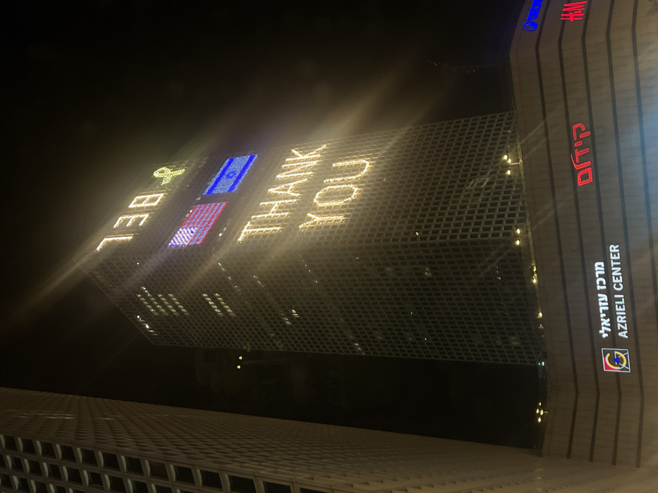 The image displays a nighttime view of the Azrieli Center in Tel Aviv, Israel