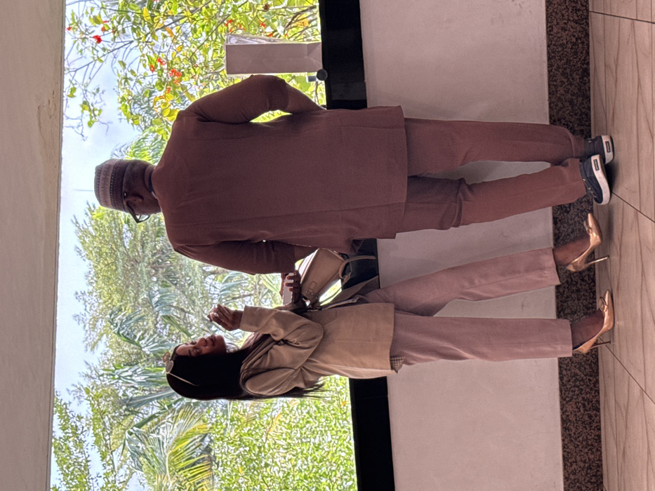The image depicts two individuals, a woman and a man, standing indoors beside a large window overlooking a lush green exterior. The scene's environment, featuring tropical foliage, aligns with a Nigerian setting; however, the specific city of Itirin cannot be visually confirmed from the image data. On the left, an adult woman stands, facing towards the right with her body slightly angled towards the viewer. She has long dark hair and wears sunglasses pushed onto her head. Her attire consists of a light beige blazer over a patterned garment, light pink trousers, and gold stiletto heels with bow details. She holds a small, light-colored object to her mouth with her right hand, suggesting consumption, while a beige handbag hangs from her left shoulder. Her left leg is bent at the knee, resting on the ball of her foot. On the right, an adult man stands with his back largely to the viewer, facing out the window. He wears a light-colored, patterned traditional Nigerian cap (fila) and a matching loose-fitting brown tunic and trousers. His hands are not visible, possibly in his pockets. He wears dark blue casual shoes. The interior features a plain, light-colored wall and a speckled tiled floor. A dark, possibly metal, ledge or frame separates the indoor space from the outdoor environment. A white, rectangular object, resembling a vase or decorative container, rests on this ledge behind the man. The exterior view through the window is dominated by dense green foliage, including palm fronds and other trees, with scattered red flowers visible on a plant to the right. The lighting suggests bright daylight conditions.
