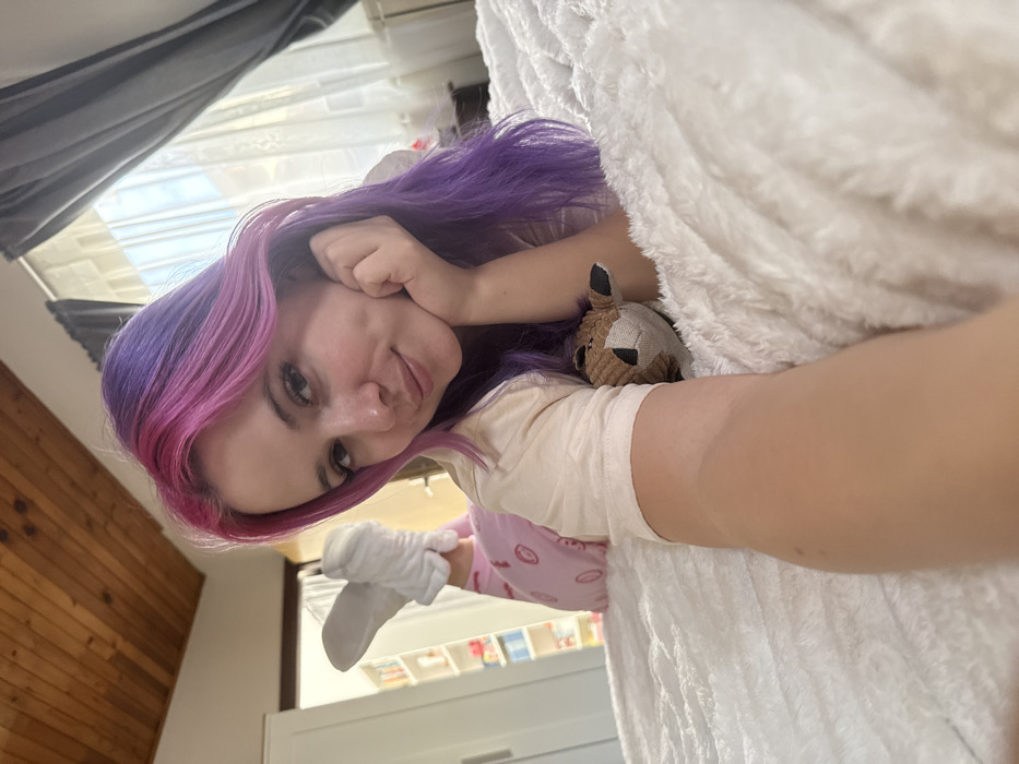 An individual, identified as a young adult female, is depicted lying prone on a white, textured bedspread in an indoor setting. She has distinct dual-toned hair, pink at the top fading into purple. Her head is propped on her left hand, resting against her chin, and she is looking directly at the camera with a slight smile. Her right arm is extended towards the camera, suggesting she is holding the recording device for a selfie. She is wearing a light-colored (cream/beige) short-sleeved t-shirt and pink pajamas with a donut-like pattern. Her feet are elevated, bent at the knees, and she is wearing thick white, fluffy socks. A small, brown, ribbed stuffed animal, possibly a deer or fawn, is tucked under her right arm. The background on the left shows a light-colored piece of furniture, likely a wardrobe, and behind it, a white open shelving unit containing various items. The ceiling above this area is composed of light-colored wooden planks. On the right, a window with natural light streaming through is partially covered by dark gray curtains. Below the window, a white radiator is visible. The scene appears to be a bedroom within a residential dwelling in the City of Zagreb, Croatia.