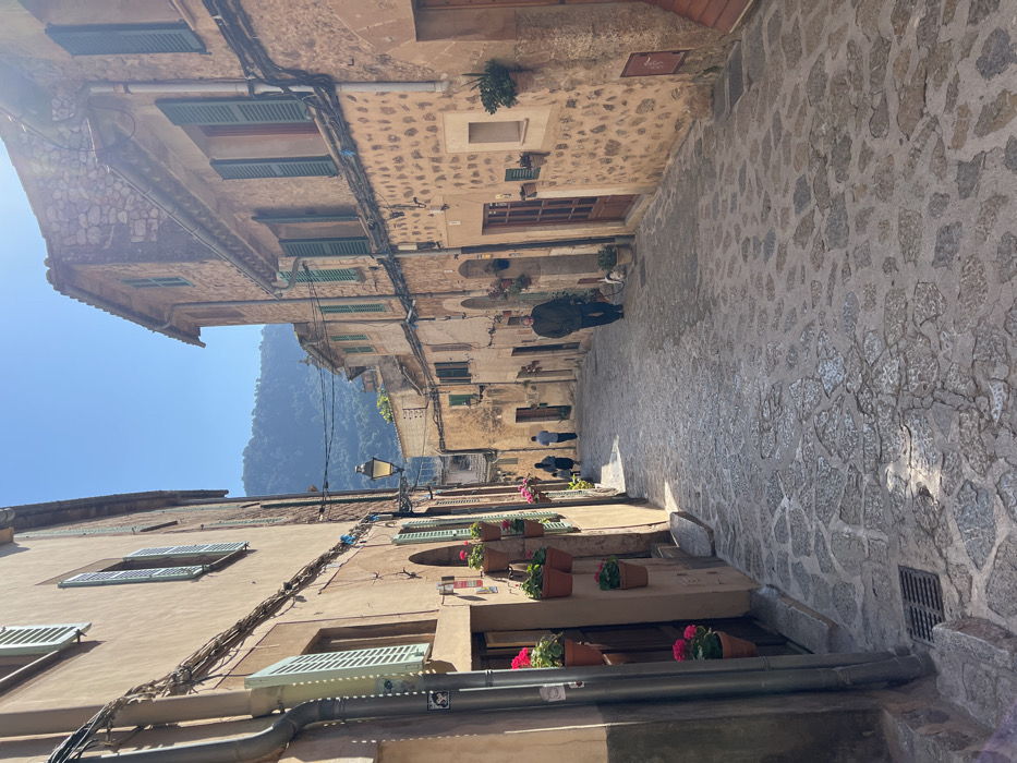A narrow, uphill cobblestone street in Valldemossa, Spain, is depicted under bright sunlight