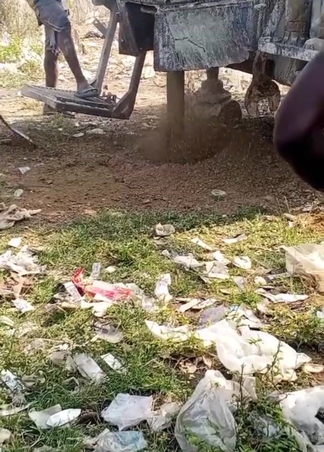 The scene shows a well drilling operation in a grassy area littered with white plastic bags and some red debris