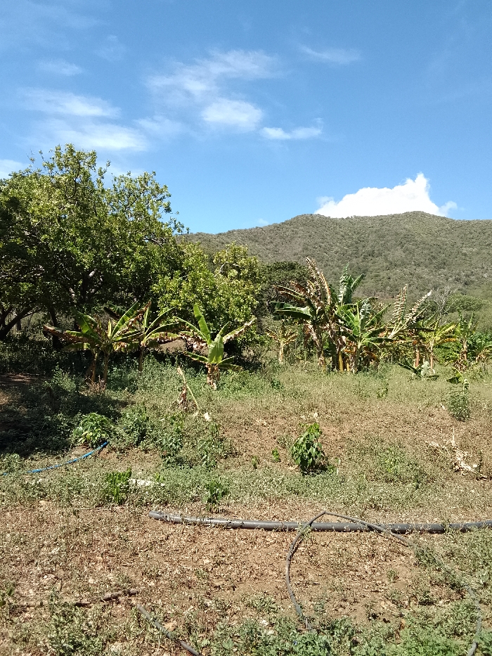 This image depicts a rural agricultural landscape located in Santa Ana, Venezuela, under a clear blue sky with sparse white cumulus clouds. In the background, a large, tree-covered mountain range extends across the horizon. The middle ground features an uneven terrain dominated by multiple clusters of banana or plantain trees, characterized by their large green leaves, some showing signs of brown or yellowing. Additional deciduous trees with dense green foliage are visible behind and to the left of the banana plants. The foreground consists of dry, reddish-brown earth with sparse, low-lying green vegetation, some appearing as weeds and some as small cultivated plants. An irrigation system is evident: a blue hose-like object is visible on the ground in the lower-left quadrant, and a prominent black, segmented irrigation pipe runs horizontally across the lower-middle of the frame, with smaller black drip lines branching from it into the soil. No human figures, animals, or man-made structures beyond the irrigation components are present in the scene.