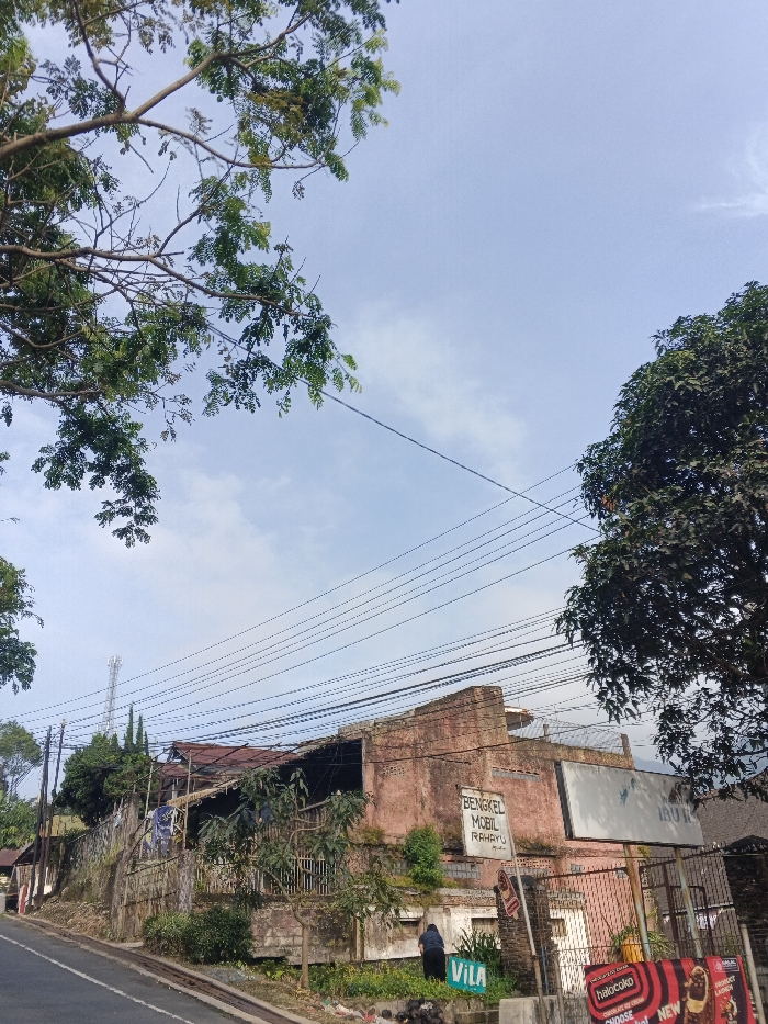 This image depicts a daytime street scene in the city of Unknown, Cambodia, under a clear light blue sky with scattered thin white clouds. Green leafy tree branches partially extend into the upper left quadrant, while a dense green tree canopy occupies the upper right. Multiple black electrical wires crisscross the sky, spanning horizontally across the upper middle section of the frame. A paved asphalt road runs along the lower left, gently sloping upwards to the left. Alongside the road, a low stone wall separates it from structures built into a hillside. On the far left, a multi-story building with a dark roof and laundry hanging on a line is visible. Behind these structures, a slender white telecommunication tower stands in the distance, flanked by dark green, columnar trees. A prominent two-level building with a weathered reddish-pink brick or stucco exterior is situated on the right side of the road. A white sign affixed to its facade displays the Indonesian text "BENGKEL MOBIL RAHAYU," indicating a car workshop. Above this, a faded, unreadable white billboard is attached. In the lower right foreground, a single individual, dressed in dark clothing, is bent over, facing away from the camera, near the base of the main building. They appear to be interacting with ground-level vegetation or an object. A small green sign with white text reading "VILA" is positioned nearby. Partially visible in the bottom right corner is a vertical advertisement for "Halocoko" ice cream and "Indofood" products, containing text like "CHOOSE NEW TASTE" and "PROMO CASHBACK."