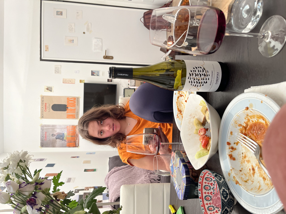 The image depicts an indoor dining scene within a residential setting in Milan, Italy. **People:** One young female with shoulder-length brown hair, wearing an orange t-shirt and dark blue leggings, is seated at a dark dining table, looking directly forward with a neutral expression. She holds a mobile phone in her left hand, partially obscured by an empty wine glass. **Subjects/Objects on the Table:** The dark wooden table shows signs of a recently concluded meal. A white plate with a blue rim contains red sauce residue and a silver fork. To its left, a small patterned bowl holds a small amount of solid food. A white rectangular bowl contains leftover salad components, including cherry tomatoes, cucumber slices, and dressing. A dark blue metallic tin box with colorful graphics is also present. A green glass bottle of "GAROFOLI ROSSO CONERO" red wine stands centrally. Two tall-stemmed wine glasses are visible; the one on the left is largely empty, while the one on the right is approximately one-third full of red wine and rests on a light-colored wooden coaster beside a small, cylindrical metal pot. **Environment:** The background features a white wall adorned with numerous small photos, postcards, and papers taped haphazardly. Two larger promotional posters, both branded "BOTTEGA VENETA" and featuring "ON THE ROCKS" text, are centrally displayed. A dark flat-screen television is mounted on the wall below these posters. To the left, a segment of a sofa with a purple throw blanket is visible. To the right, a white door with a gold handle and what appears to be a peephole is also decorated with small attached papers. A brown backpack rests on the floor next to the door. In the extreme left foreground, a vase contains white and purple flowers.