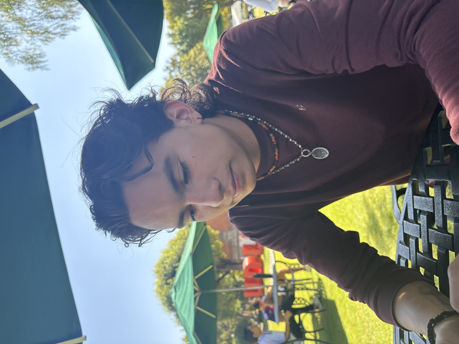 A young man with dark, wavy hair and fair skin poses outdoors. He is wearing a maroon long-sleeved shirt and two necklaces: one of small brown beads and another of a silver chain with a medallion. He is partially obscured by a black metal table. In the background, there is a grassy area with green umbrellas, trees, and people sitting at tables. The sky is clear blue. The image is taken from a low angle and appears to be rotated slightly.