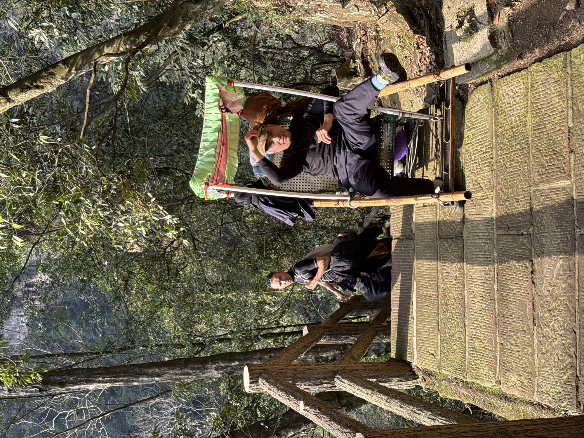 The scene is set on a stone path traversing a dense forest within Wulingyuan, China. A male subject, appearing to be of East Asian descent, is seated on a bamboo carrying chair, positioned on the right side of the path. He wears a dark long-sleeved shirt, dark trousers, and a light-colored cap, looking towards the camera with his right hand on his cap. The carrying chair features a light green and red fabric canopy; a dark jacket and a brown bag are suspended from its rear frame. Ahead and to the left of the seated subject, a second male subject, with a light complexion and dark hair, stands on the stone steps. He wears a black short-sleeved top with white strapping and dark trousers, carrying a light-colored shoulder bag over his right shoulder and a dark jacket draped over his left arm. He is looking over his left shoulder towards the camera. The stone path, composed of textured blocks, shows moss growth and is bordered on the left by a rustic wooden railing. Dense tree cover with green foliage surrounds the path, and a distant grey rocky cliff face is visible through the upper canopy. The area is illuminated by direct sunlight, casting distinct shadows.