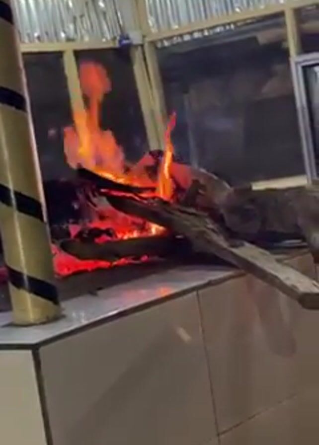 A close-up shot shows a wood fire burning on a white-tiled surface. The flames are bright orange and red, leaping up from the burning logs. A few larger pieces of wood sit on top of the fire, and some smaller twigs are visible. The fire appears to be inside some kind of structure, with a window behind it and a corrugated metal roof overhead. A pole with black and yellow stripes is partially visible on the left side of the frame.