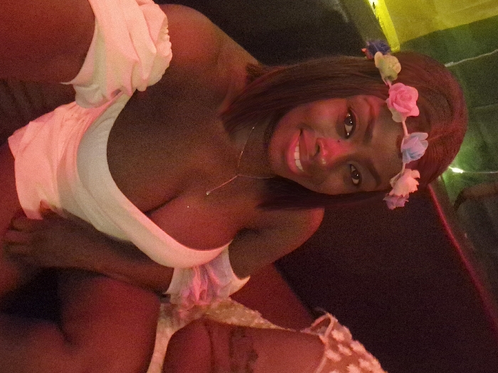A young, dark-skinned woman smiles at the camera. She wears a white top with puffed sleeves and a delicate silver necklace. A floral headband adorns her dark hair, featuring pink, blue, and yellow flowers. The lighting is warm, casting a red hue over the scene. She is seated on a dark-colored couch.