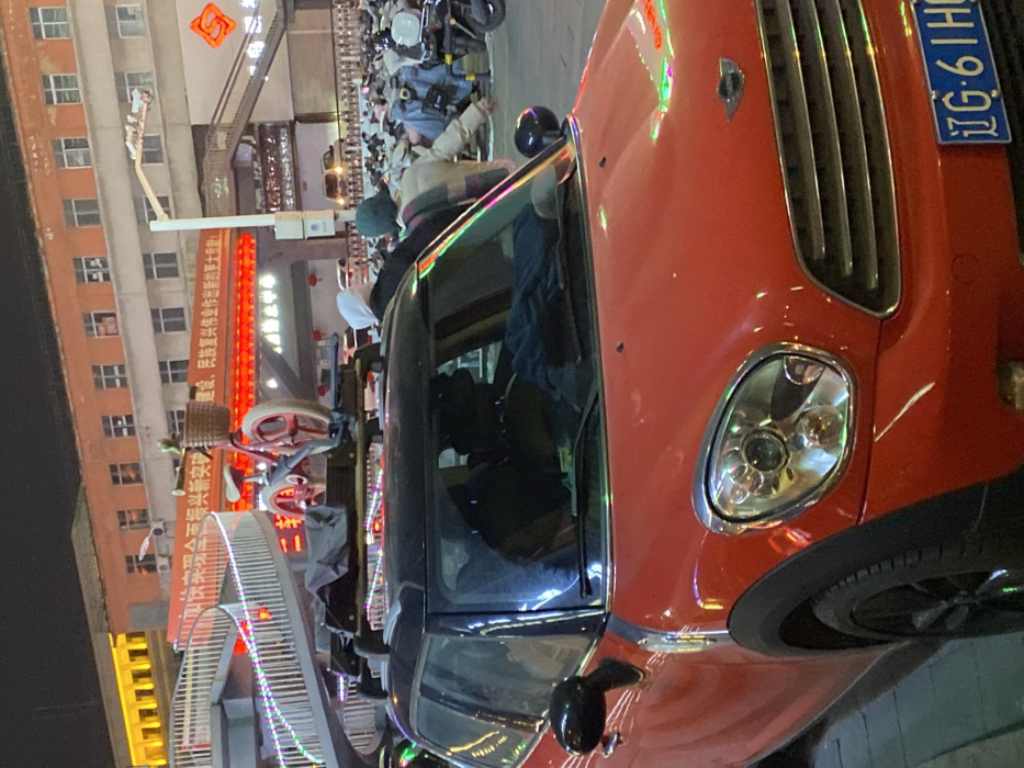 The image depicts a nighttime urban scene in Linghe District, Jinzhou, Liaoning Province, China. In the immediate foreground, a red Mini Cooper Countryman with a black roof is parked. A roof rack is installed on the vehicle, securing a small, red children's bicycle with white tires and a wicker basket on its handlebars, alongside a dark, covered object. The car's front license plate is partially visible, displaying "辽G·61HQ". Two individuals are silhouetted inside the vehicle through the windshield, with blue fabric resting on the dashboard area. To the right of the Mini Cooper, several people are partially visible, including one wearing a white hoodie and another in a striped jacket and green beanie. Behind them, a densely packed area contains numerous parked electric scooters and motorcycles. A multi-level urban structure with vehicles and people on elevated sections is visible further back. A white pedestrian overpass, brightly illuminated with green, red, and blue string lights, curves across the mid-ground. In the background, a prominent multi-story building with an orange-brown facade and numerous rectangular windows stands. Below this building, a large red banner bearing Chinese characters, "建设、民族复兴伟业作出新的更大贡献" (likely a political slogan), is stretched across an elevated walkway or bridge. To the left of this banner, a yellow sign with additional Chinese characters, including "凌河" (Linghe), is visible. The entire scene is artificially lit by streetlights and various luminous signs, creating reflections on surfaces.
