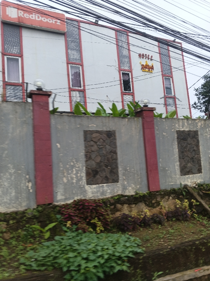 A forensic, matter-of-fact description of a scene in Kadoma, Zimbabwe, presents a multi-story building situated behind a weathered concrete perimeter wall. The building's light-colored facade is accented with red vertical strips and features multiple rectangular windows, some with visible curtains. A red "RedDoorz" sign is positioned on the upper left, while "HOTEL RAJA" with a gold crown appears on the mid-right. The grey concrete perimeter wall, approximately two meters high, shows signs of wear and includes three red-painted vertical pillars, two of which are topped with spherical outdoor lights. Barbed wire runs along the wall's top edge, behind which large-leafed green plants are visible. Two sections of the wall are inlaid with dark, irregularly shaped stones. Below the wall, a terraced garden displays various green, reddish-purple, and yellowish-green foliage. Overhead, numerous dark utility wires crisscross the sky. No individuals or specific actions are observed within the frame.