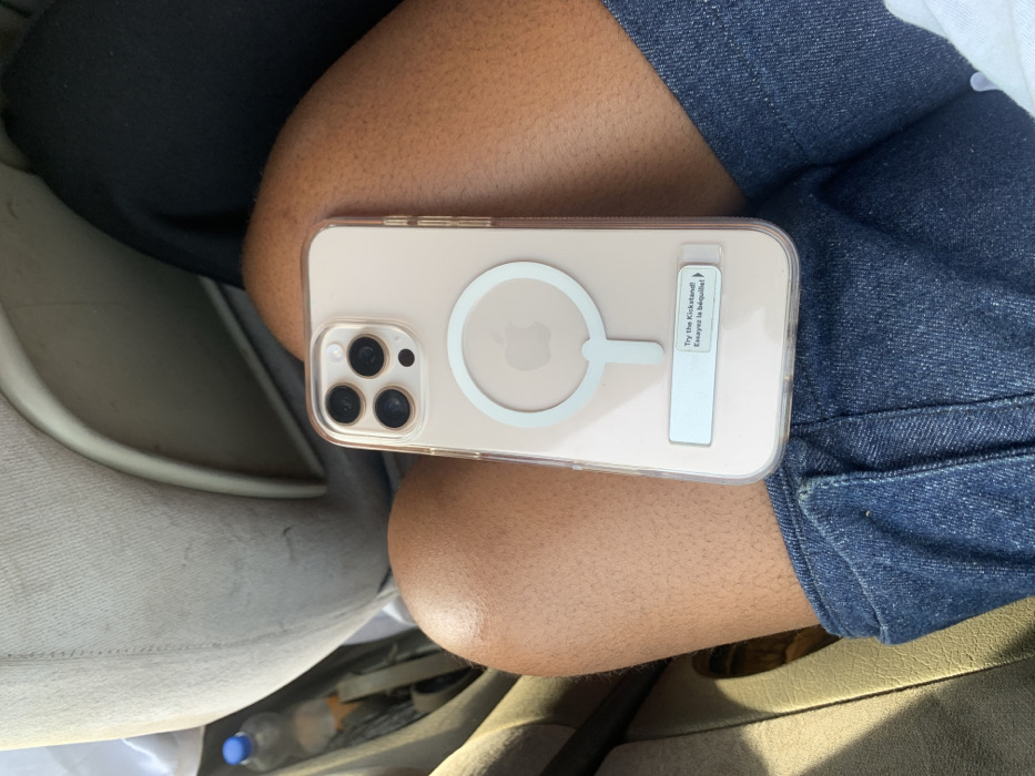 The image displays a gold-toned iPhone, likely an iPhone 15 Pro Max due to its three prominent rear camera lenses, encased in a clear MagSafe-compatible cover. The case features a white circular MagSafe ring and an integrated pull-out kickstand bearing the text "Try the Kickstand! / Essayez la béquille!". The phone rests horizontally on the bare, brown-skinned upper thighs of an individual, who is also wearing blue denim shorts or jeans. In the background, a light-colored fabric car seat is visible, and to the upper left, a plastic water bottle with a blue cap is partially seen within a vehicle's storage compartment. The scene is situated inside a vehicle in Keffi, Nigeria.