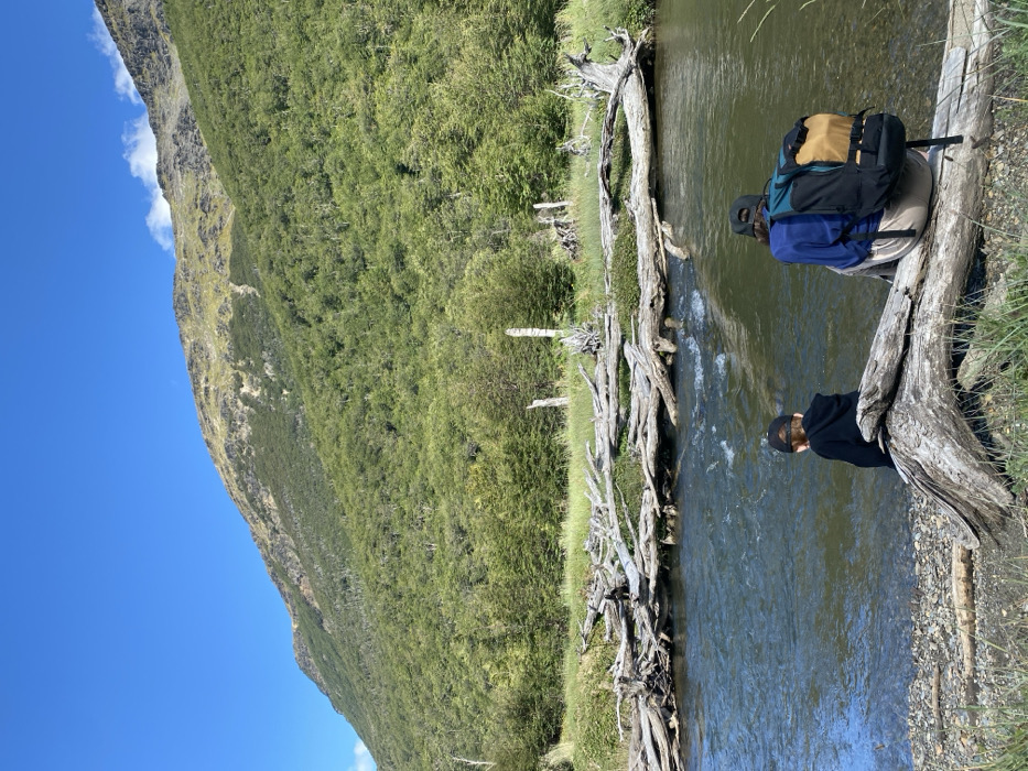 Two people are sitting on a log that crosses a river. One wears a blue shirt and backpack, the other a black hoodie. The river flows between them. On the other side of the river is a bank with grass and a tangle of dead tree branches. Beyond the river bank is a hillside densely covered with green trees, rising to a rocky peak under a clear blue sky.