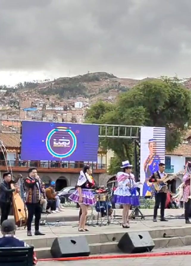 A band is performing on a stage in a public square. The band consists of two women singers, several male musicians playing guitars, and a drummer. They are wearing traditional Andean clothing. Behind the stage is a large fountain with a statue on top, as well as buildings and hills in the background. The sky is overcast. There are screens flanking the stage. People are watching the performance. A red ribbon is on the ground.