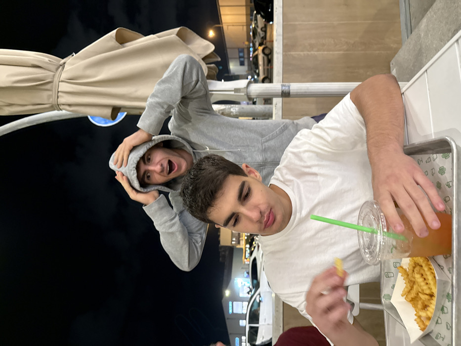 A nighttime photograph shows two young adult males at an outdoor dining area in Tel Aviv, Israel