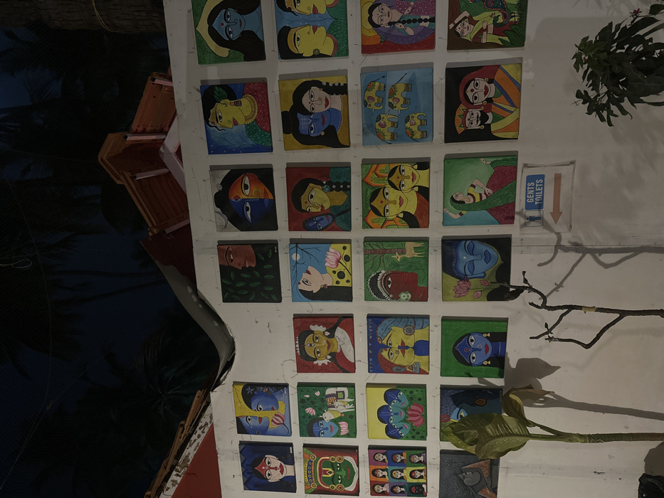 - "The image depicts an illuminated outdoor wall adorned with approximately 36 square, colorful folk-art paintings, likely in the Madhubani style, located in Kolamb, India" by FM-fbKUu1, licensed under CC BY 4.0