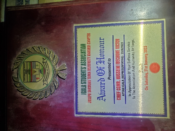 n "Award of Honour" presented by the Igala Students' Association, Joseph Sarwuan Tarka University Makurdi Chapter, to Chief Comr. Husseini Ibechone Victor Attah Igala (Representative) for the period 2020/2021. The award is in appreciation of selfless service to the association and humanity. The presentation occurred on Saturday, January 21, 2023. A university emblem with laurel leaves surrounds the award plaque.