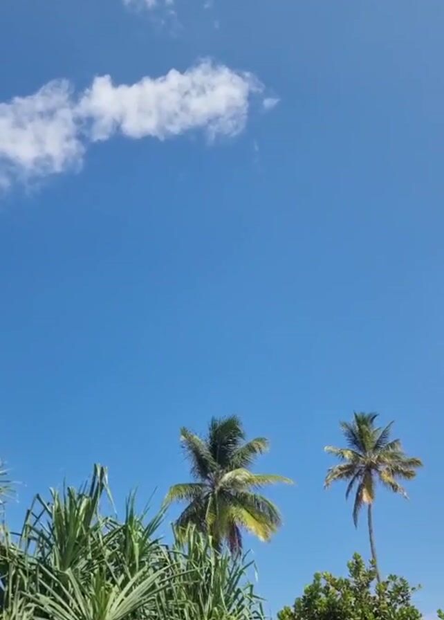 bright blue sky with a few scattered white clouds. Below the sky, there is lush, green vegetation, predominantly palm trees and other leafy plants. The camera slowly pans upwards, revealing more of the palm trees against the clear sky. The scene gives the impression of a tropical or coastal environment.