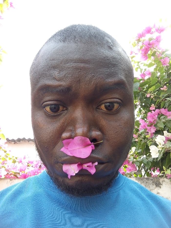 The image presents a close-up, head-and-shoulders portrait of an adult male with dark skin, facing directly into the camera. Two magenta-pink bougainvillea bracts are visible on his face: one is placed horizontally on the bridge of his nose, and another is positioned on his lower lip. The individual has short, dark hair, dark eyes, and a light stubble on his chin and jawline. He is wearing a blue, crew-neck garment. The background, largely out of focus, reveals vibrant pink bougainvillea flowers with some white variations on a green-leafed shrub to the right. To the left, a section of a grey corrugated roof and a light-colored concrete wall are visible. The scene is set outdoors in what appears to be a residential or garden area within Dakata, Nigeria.