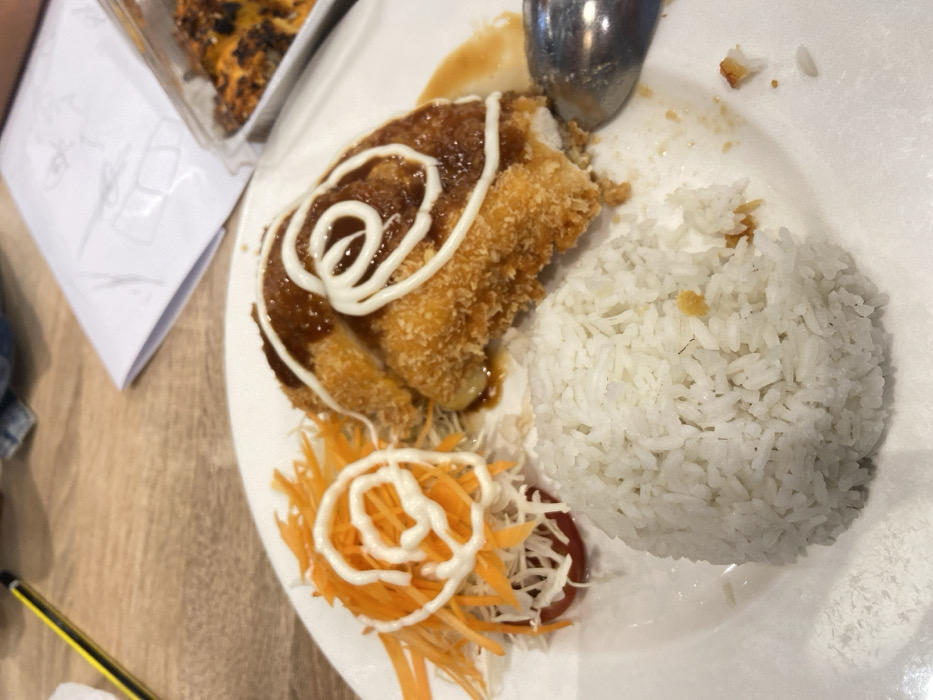 A close-up, elevated perspective displays a partially consumed meal on a white circular plate, situated on a light-colored wooden table. The plate holds a central mound of white rice, two pieces of golden-brown breaded, fried cutlet partially covered with a viscous dark brown sauce and a swirl of white opaque sauce. A portion of one cutlet appears to have been consumed. To the left, a side portion of shredded orange carrots and white shredded vegetable, arranged atop a red tomato slice, also features a swirl of white opaque sauce. A silver spoon rests on the right side of the plate. Minor food crumbs and sauce traces are visible on the white plate surface. In the upper left background, a yellow and black pencil is partially visible. The upper right background shows a folded white paper document and a translucent plastic container partially filled with a yellowish-brown granular substance. No human subjects are visible. This scene depicts a dining setting in an unidentified indoor establishment in Sidoarjo, Indonesia.