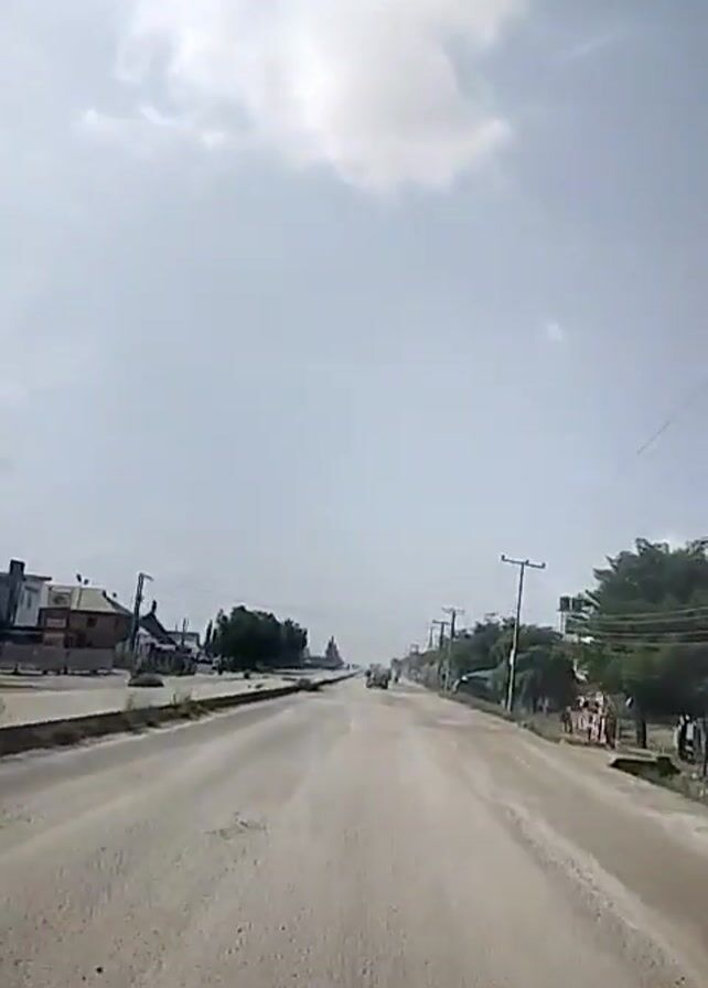 vehicle driving down a dusty, partially paved road. The sky is mostly light blue with some scattered clouds. On either side of the road are buildings, trees, and utility poles with wires. There are a few other vehicles in the distance.