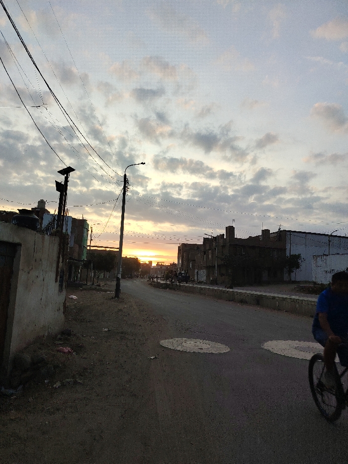 - "The image displays an urban street scene in Florencia de Mora, Peru, captured during either sunrise or sunset, indicated by the low sun casting an orange glow on the horizon and the generally dim lighting" by FM-xu6Q93, licensed under CC BY 4.0