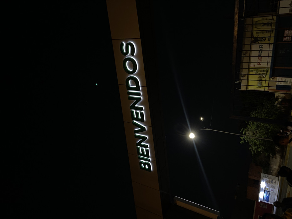 The image displays a nighttime scene in Punta de Piedras, Venezuela. A large overhead sign, horizontally mounted on a light-colored structure, prominently features the word "BIENVENIDOS" (Welcome) in illuminated green block letters with a white halo effect. Below the sign, a single bright streetlamp on a pole acts as the primary light source, emitting a strong radial glare. In the lower left portion of the frame, several blurred human figures are visible, indicative of pedestrian movement, though specific features or actions are indistinct due to the low light and motion blur. To the left of the streetlamp, a small building or kiosk with illuminated windows is partially observed. On the right, a dark metal fence or gate stands in front of a building adorned with yellow advertising panels, one displaying the text "PROTOR." Sparse vegetation is present near the streetlamp and behind the fence. The sky above is uniformly dark, characteristic of a nighttime environment.