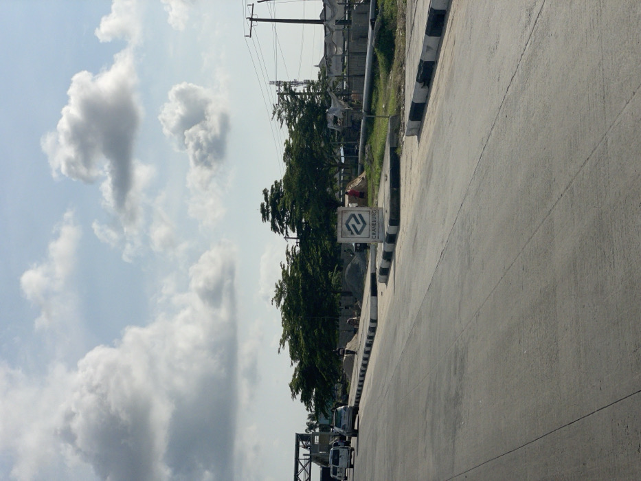 A view of a concrete road alongside a curb with alternating black and white markings. A sign with the name "Cranlburg" sits next to the curb. The opposite side of the road is lined with trees. Overhead power lines are visible above buildings. A partially cloudy, bright sky occupies the upper portion of the image. Several vehicles are seen in the distance towards the bottom of the frame.