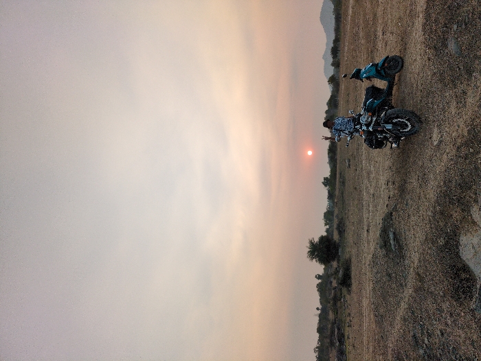 The scene is set in Ayyan Palayam, India, at either sunrise or sunset. The sky displays a gradient from light gray at the top to orange-pink near the horizon, with a reddish-orange sun visible low in the sky, slightly to the right of center. The foreground and midground consist of dry, uneven terrain covered with reddish-brown earth, gravel, and sparse, withered vegetation. Scattered bushes and small trees are present in the midground, with distant, silhouetted hills or mountains visible on the right horizon. One individual stands between two parked motor vehicles. The person wears a patterned long-sleeved shirt, dark trousers, and a hat. They are facing towards the viewer, with their left arm raised and hand forming a "peace sign" (V-shape). Their right hand appears to be resting on the handlebars of a dark-colored motorcycle positioned to their left. The motorcycle features knobby tires and has luggage strapped to its rear. To the right of the motorcycle and slightly behind it is a teal-colored scooter. Both vehicles are stationary on the dry ground.