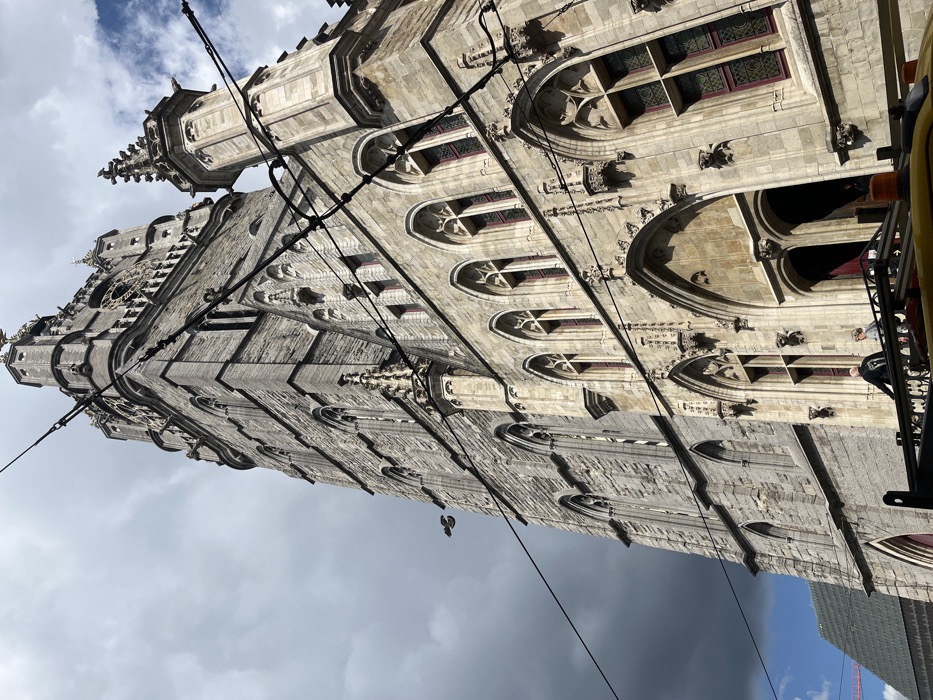 The image captures the Belfry of Ghent and the adjacent Cloth Hall, located in the city center of Ghent, Belgium, from a low-angle perspective looking upwards