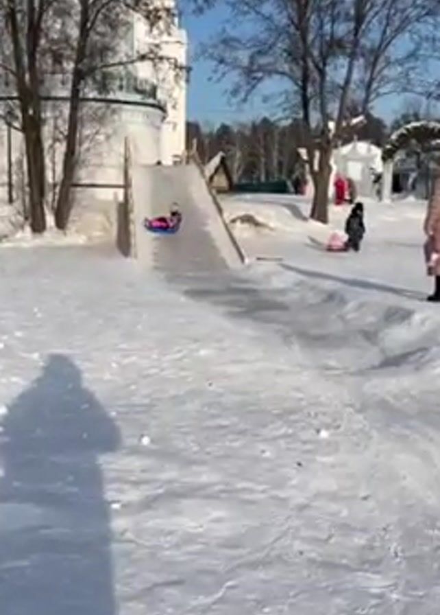 In a snowy outdoor setting, a young child is seen sliding down a small, angled ramp on a blue and pink snow saucer. The ramp is positioned next to a tall, white building, possibly a church tower, with bare trees nearby. The child is wearing a colorful jacket and a matching hat. As the child descends the ramp, they enter a shallow, snowy trough that leads into a flat, snowy field. Several other people, including adults and children, are visible in the background. One adult, wearing a long beige coat, stands watching near the end of the trough. The weather appears sunny, with shadows cast across the snow, suggesting a clear day. The overall scene conveys a wintery, recreational atmosphere.