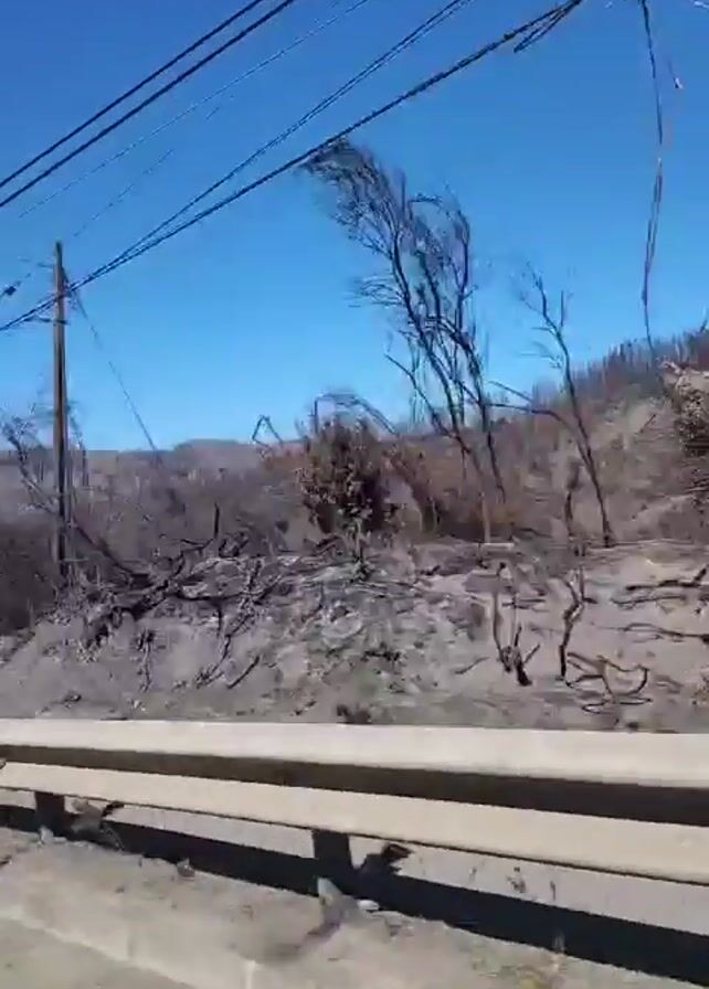 landscape of hills covered in burnt trees and vegetation, seen from a moving vehicle. A metal guardrail runs along the side of the road. Power lines and utility poles are visible overhead. As the vehicle moves forward, a glimpse of a town or industrial area with tanks and other structures can be seen in the distance. The sky is clear and blue.