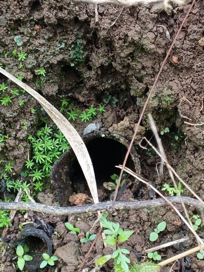 A dark opening is surrounded by damp soil, moss, and small green plants. The opening may be a pipe or a burrow, partially obscured by a dried leaf. Earthy tones dominate, with glimpses of decaying organic matter and thin twigs strewn around. The scene suggests a natural environment in a state of quiet, undisturbed growth.