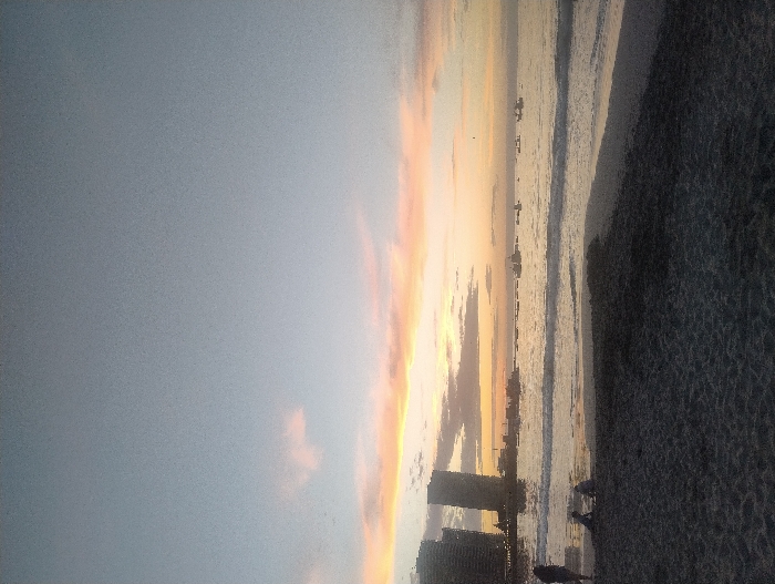 A serene beach scene unfolds at dusk. The sky transitions from soft blue to a vibrant blend of orange and pink near the horizon. Silhouetted buildings stand along the shoreline, bordering the calm sea. Gentle waves lap the sandy beach, where a few figures can be discerned walking. The beach appears dark and textured in the foreground, contrasting with the bright sky and water.