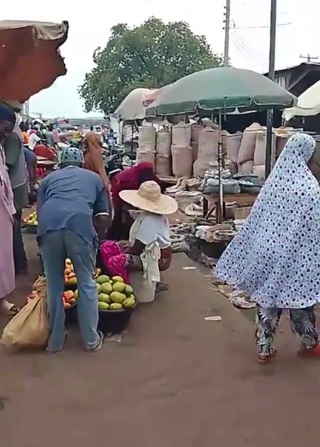 busy outdoor market in what appears to be an African or Middle Eastern setting. People are seen browsing and buying fruits, grains, and other goods. A man in a pink robe stands near a display of mangoes and other fruits. Another man is loading mangoes into a bag. A man wearing a white jersey with the name "AHMED" and the number "19" on the back is riding a motorcycle. A yellow auto-rickshaw, also known as a "Keke", is parked nearby. The market stalls are covered with umbrellas and tarps to provide shade. There are bags of grain stacked in the background. The overall atmosphere is bustling and crowded.