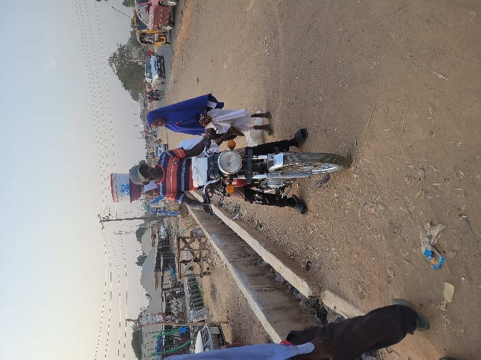 A man wearing a striped shirt and helmet sits on a motorcycle. He appears to be stopped by the side of a dirt road. A woman in a blue hijab and white dress stands nearby. There is a bucket with the words "TOP PAINS" on it attached to the bike. Cars are seen passing in the background along with telephone poles. A concrete drainage ditch is visible on the edge of the road.
