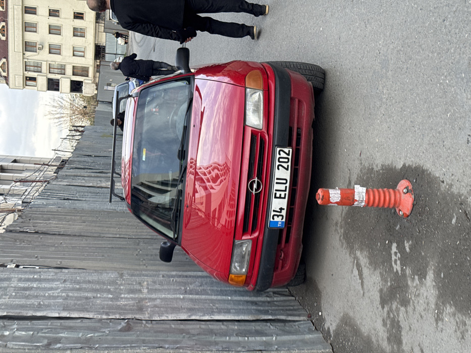 The scene depicts an urban street in Zeytinburnu, Turkey, under an overcast sky. In the foreground, a red Opel Astra F hatchback, bearing Turkish license plate "34 ELU 202," is parked facing the camera, positioned adjacent to a tall, corrugated galvanized metal fence. The vehicle is equipped with a black roof rack. Directly in front of the car's bumper, an orange ribbed traffic bollard, showing signs of wear and partially peeled reflective tape, stands on the asphalt pavement. The pavement exhibits damp patches and stains. In the mid-ground, beyond the vehicle, several male subjects are visible walking away from the camera. One male, dressed in dark clothing, is partially observed on the right side of the frame. Further down the street, another male in a dark jacket is walking, and a third individual is partially visible near a parked blue sedan. The street continues into the background, where an older, multi-story residential building with multiple windows and balconies is visible. A modern building is partially obscured by the metal fence to the left. Bare trees are present in the background, indicative of a dormant season. No direct interactions between individuals are observed.