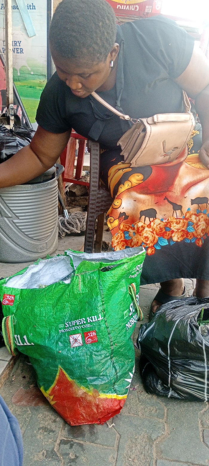 An adult female, with short dark hair, wearing a black short-sleeved top, a colorful patterned skirt featuring animal silhouettes and floral designs, and sandals, is seated on a dark-colored chair. A light beige shoulder bag with a bird motif is slung across her body. She is leaning forward, looking down towards the ground. The scene is located in Kwachiri, Nigeria, outdoors or in a semi-enclosed commercial space. On the grey paved ground in front of her, there is a large, partially crumpled green woven plastic bag. The bag features prominent branding including "SUPER KILL MOSQUITO COIL," a mosquito icon with a cross, and "12h x10" text, with red and yellow coloration at its base. Adjacent to this green bag is a smaller, tied black plastic bag. To the woman's left, a grey ribbed plastic bin (partially labeled "SONIC 23") stands near a mop with a white head. In the background, a light blue vertical panel with partially visible white text ("DAIRY POWER") is present, along with a red and white sign displaying "CHIVITA" branding above.