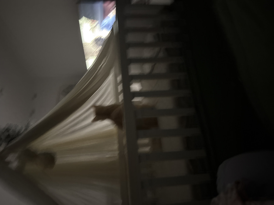 A blurry indoor shot shows a cat amidst an indoor hammock or suspended bed frame. The cat appears to be orange or light brown, seen partially obscured by the hammock's light-colored fabric. A set of stairs or ladder is on the right side of the image, leading up to the hammock. The background includes a window with outside light and a dark curtain or wall. The overall image has a slightly grainy quality and is difficult to discern clearly due to motion blur.