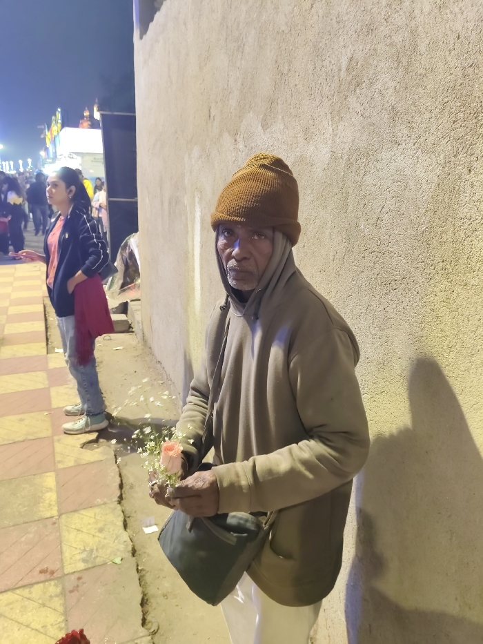 This nighttime photograph depicts a street scene in Kolkata, India. In the foreground, positioned to the right of the frame, an adult male, appearing middle-aged or elderly, stands against a light beige, textured wall. He is wearing a dark brown knitted beanie, an olive-green hooded sweatshirt, and white pants. A dark messenger-style bag is slung over his left shoulder. He holds a small bouquet consisting of one light pink rose and multiple sprigs of white baby's breath in his left hand. His face, exhibiting a weathered appearance and a light mustache, is directed straight towards the camera with a neutral expression. Artificial yellow light illuminates him, casting a distinct shadow on the wall to his right. To the left, on a checkered yellow and red tiled sidewalk, a young adult female stands with her back partially turned towards the primary subject. She is attired in a dark jacket over a pink top, light blue jeans, and white sneakers, and carries a small black backpack. A red piece of fabric hangs from her left hand or pocket. She appears to be looking towards the left, away from the camera. The background on the left reveals a busy urban environment with blurred figures indicating pedestrian traffic. Bright, diverse artificial lights from various sources, including what appears to be a white booth or structure with a dark roof and some decorations, illuminate the area, suggesting a marketplace or public event. The ground transitions from the paved sidewalk to an uneven, unpaved surface next to the wall. No direct interaction between the visible individuals is occurring.
