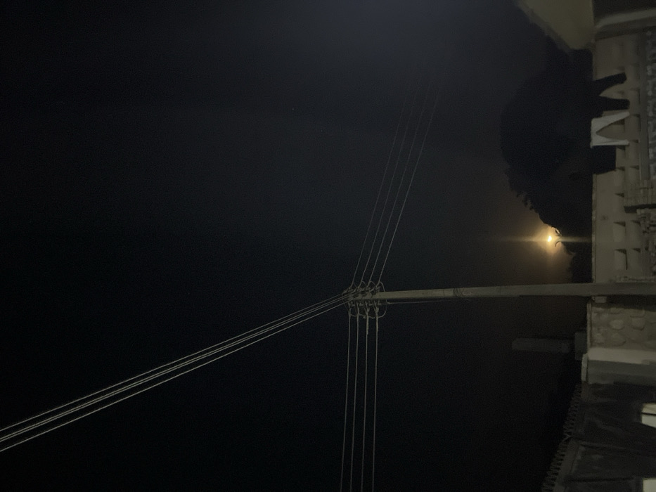 At night, overhead power lines converge near a utility pole. A dimly lit building stands on the right, with indistinct architectural details and a tree obscuring the upper portion. A faint, blurry light emanates from behind the building, possibly a street lamp or the moon, casting a soft glow. The sky appears dark and hazy.